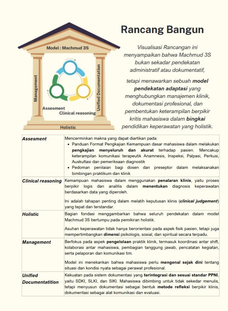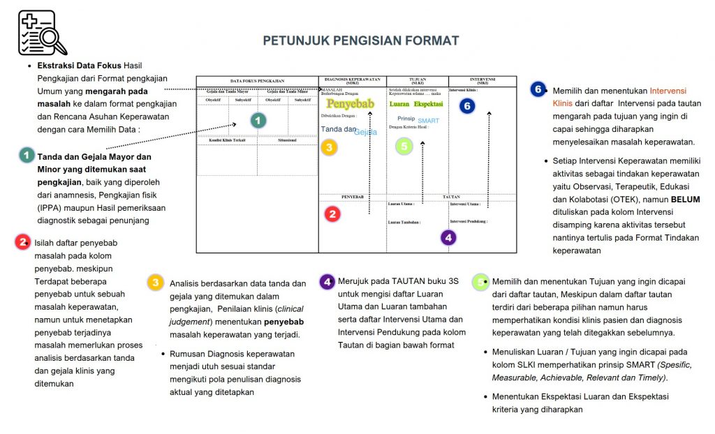 Merujuk pada Standar Diagnosis Keperawatan Indonesia (SDKI), Standar Luaran Keperawatan Indonesia (SLKI) dan Standar Implementasi Keperawatan Indonesia (SIKI) sebagai Standar yang ditetapkan oleh Organisasi Profesi yaitu Persatuan Perawat Nasional Indonesia (PPNI). Format Nursing Record (NR) dikembangkan untuk meningkatkan kemampuan pendokumentasian asuhan keperawatan sekaligus sebagai panduan dalam melakukan analisis pengambilan keputusan klinik (Clinical Judgement) utamanya dalam menetapkan Diagnosis Keperawatan, Menentukan Tujuan realistis yang akan dicapai menggunakan Prinsip SMART, dan Pendokumentasian Implementasi Keperawatan. Ketiga Standar tersebut (Unified Documentation) divisualisasikan secara intuitif agar memudahkan mahasiswa, dosen dan Preseptor dalam proses PBM yang efektif dan efisien